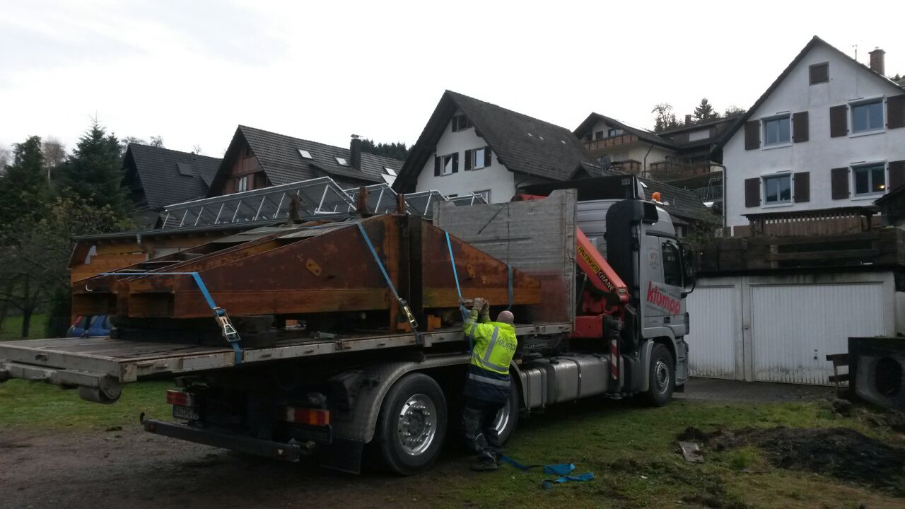 Nachdem die Ladungssicherung erfolgte, konnte auch schon der Abtransport erfolgen. Die Hebeböcke verließen nun endgültig das Harmersbachtal und fuhren in Richtung Renchen. Dort angekommen wurden die 3 Meter hohen und 1,5 Meter tiefen Böcke mit ihren 1,5 Tonnen Gewicht pro Stück an ihrem neuen Lagerplatz abgestellt.