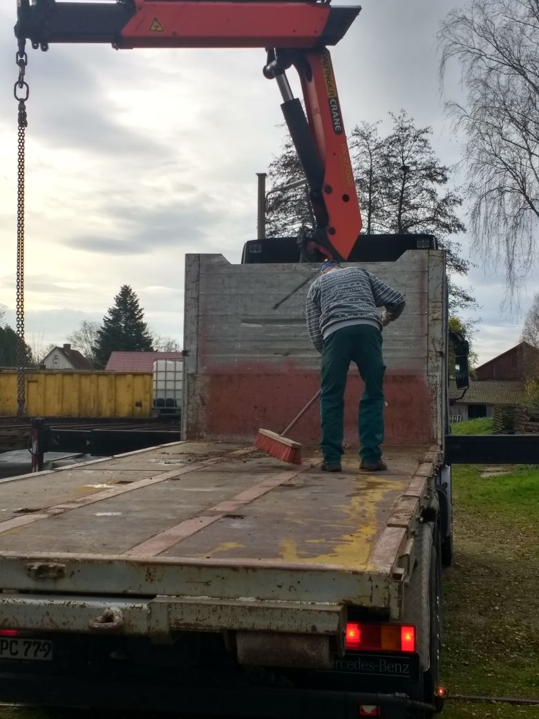 Dennoch konnten die Hebeböcke gekonnt mittels des auf dem LKW der Spedition Klumpp mitgeführten Lastkrans durch den Mitarbeiter der Spedition auf ebendiesen aufgeladen werden. Das glücklicherweise trockene Wetter und die tatkräftige Unterstützung durch die drei Mitglieder des AEV bewirkte eine zügige Beladung des LKWs.