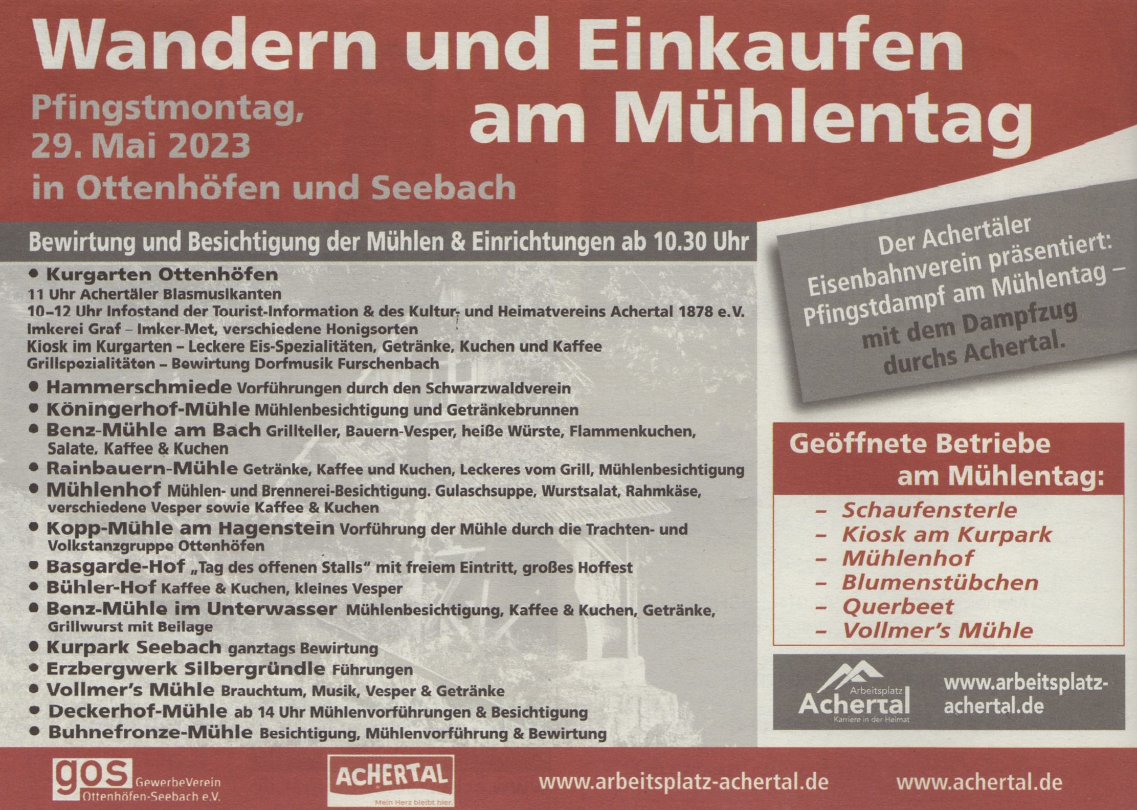 Auch in diesem Jahr erwartet Sie wieder ein breit gefächertes Angebot an zahlreichen Mühlen, die sich auf interessierte Besucher freuen! In Ottenhöfen im Kurpark freuen wir uns zudem, dass die Dorfmusik Furschenbach mit verschiedenen Grillspezialitäten kulinarisch verwöhnt, aber auch die Gasthäuser insbesondere in Ottenhöfen, aber auch dem ganzen Achertal freuen sich, Sie mit guter badischer Gastlichkeit empfangen zu dürfen!