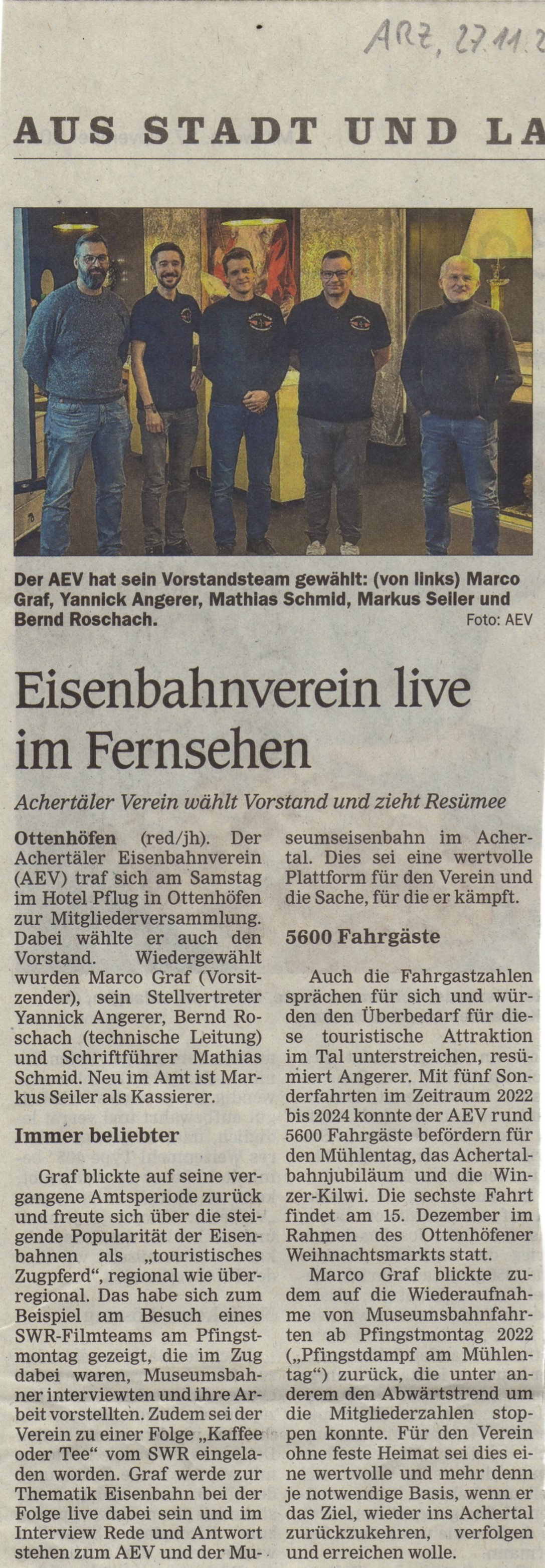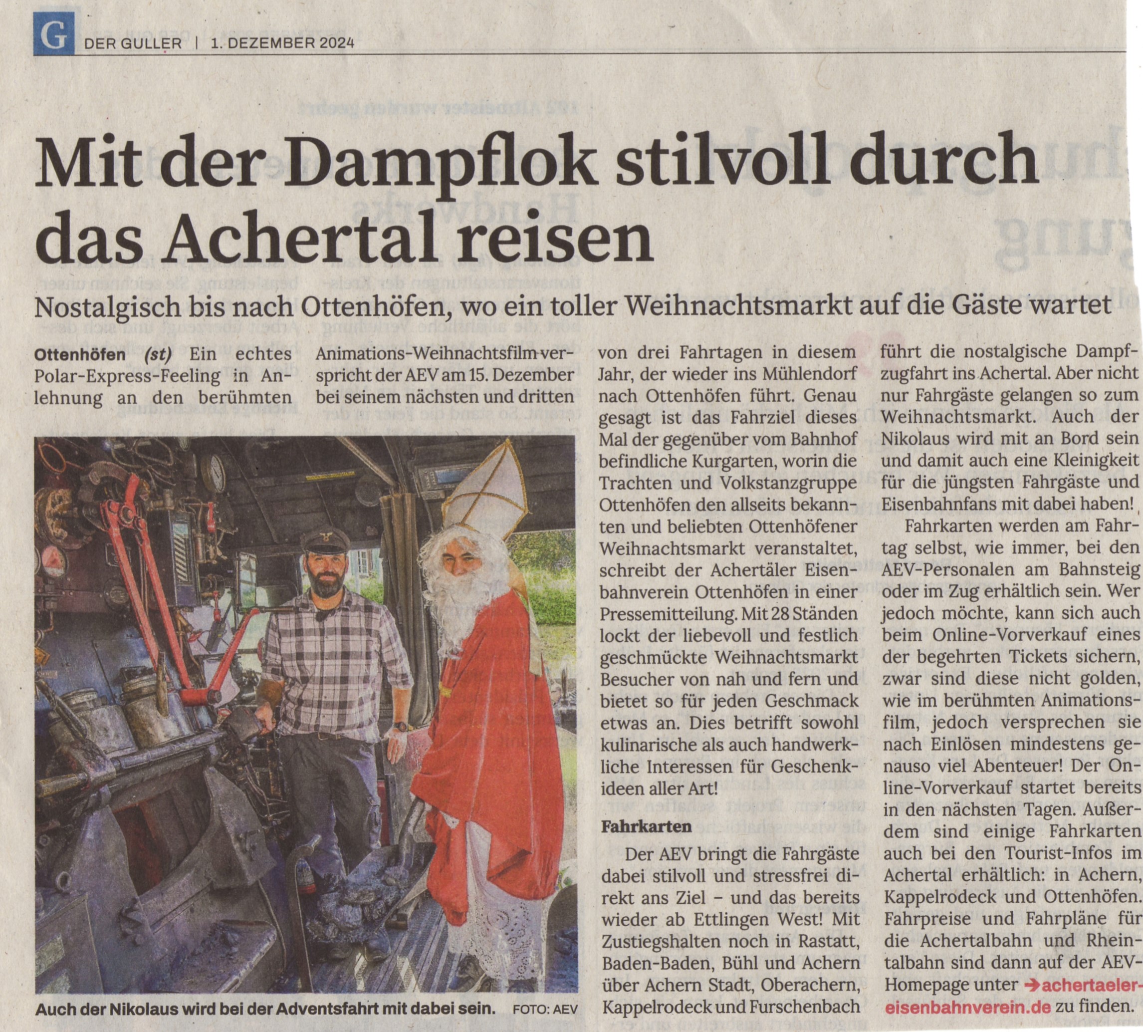 Dieses Mal hat unser langjähriger Kassier, Josef Burgert, die wohlverdiente Rente im Ehrenamt begonnen und nach über 30 Jahren Vorstandstätigkeit seinen Posten an Markus Seiler aus Kappelrodeck abgegeben. Die Vorstandschaft besteht damit aus drei Achertälern (1./2. Vorsitzender und Kassier). In der Presse wurde u.a. darüber berichtet. Ebenso ist der Weihnachtsmarkt in Ottenhöfen mit dem nächsten Dampfzug ein beliebtes Thema in den lokalen Zeitungen: