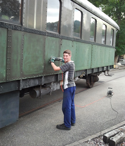 1987 von den Aktiven des Vereins innen und außen neu aufgebaut bzw. restauriert, stand unsere Donnerbüchse 26 Jahre lang im Freien, dem Regen und dem Wind, der Sonne und der Hitze ausgesetzt. Die Zeit ging nicht ganz spurlos an ihr vorüber. Von der Ferne betrachtet sah der Wagen noch ganz ansehnlich aus, aus der Nähe zeigten sich die Witterungsschäden umso deutlicher.