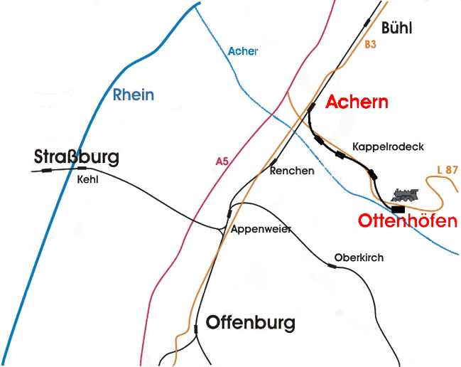 Sie fahren von der Autobahn 5 kommend an der Ausfahrt 53 „Achern“ ab und von dort die L87 Richtung Freudenstadt. Der L 87 folgen Sie bis Ottenhöfen (ca 13 Km)